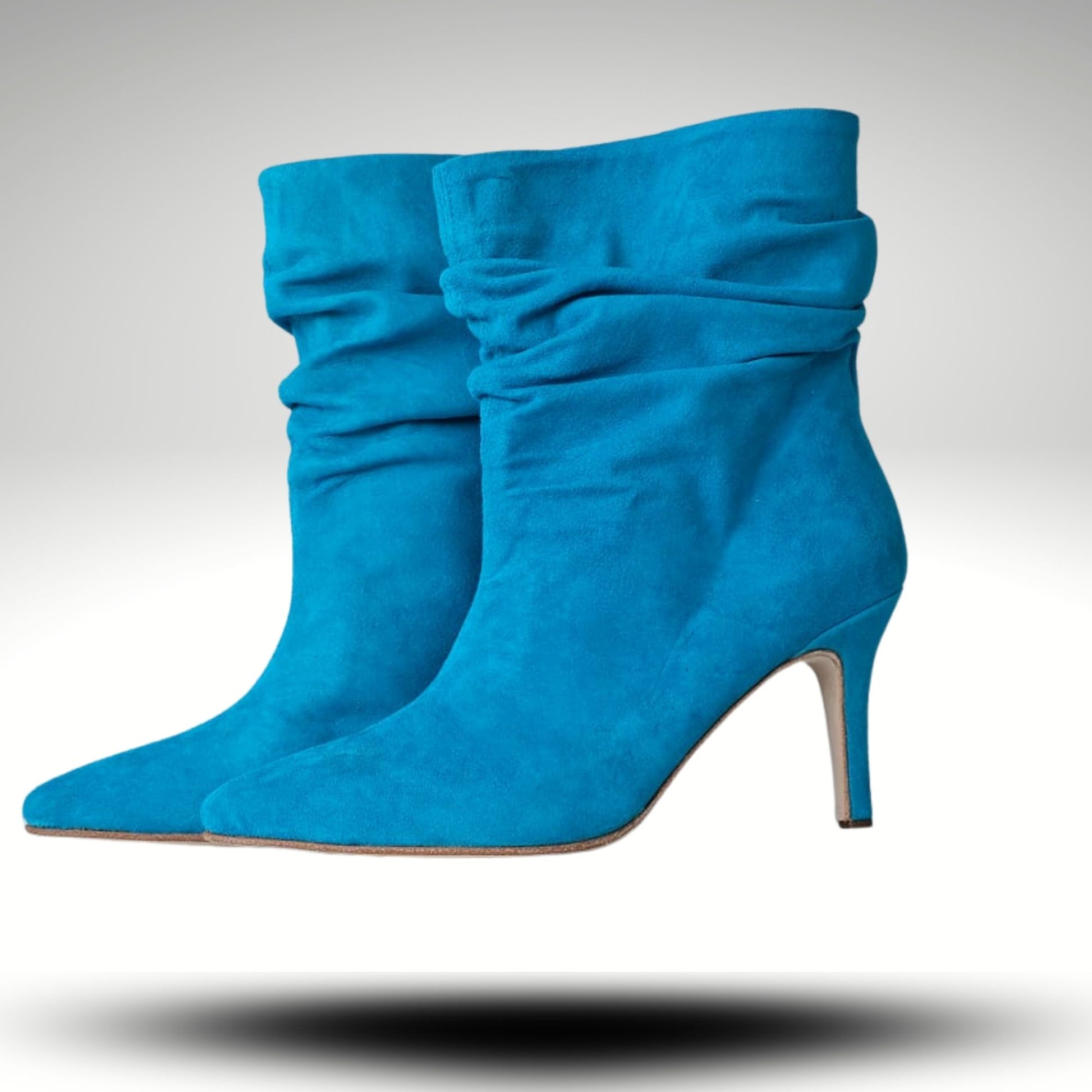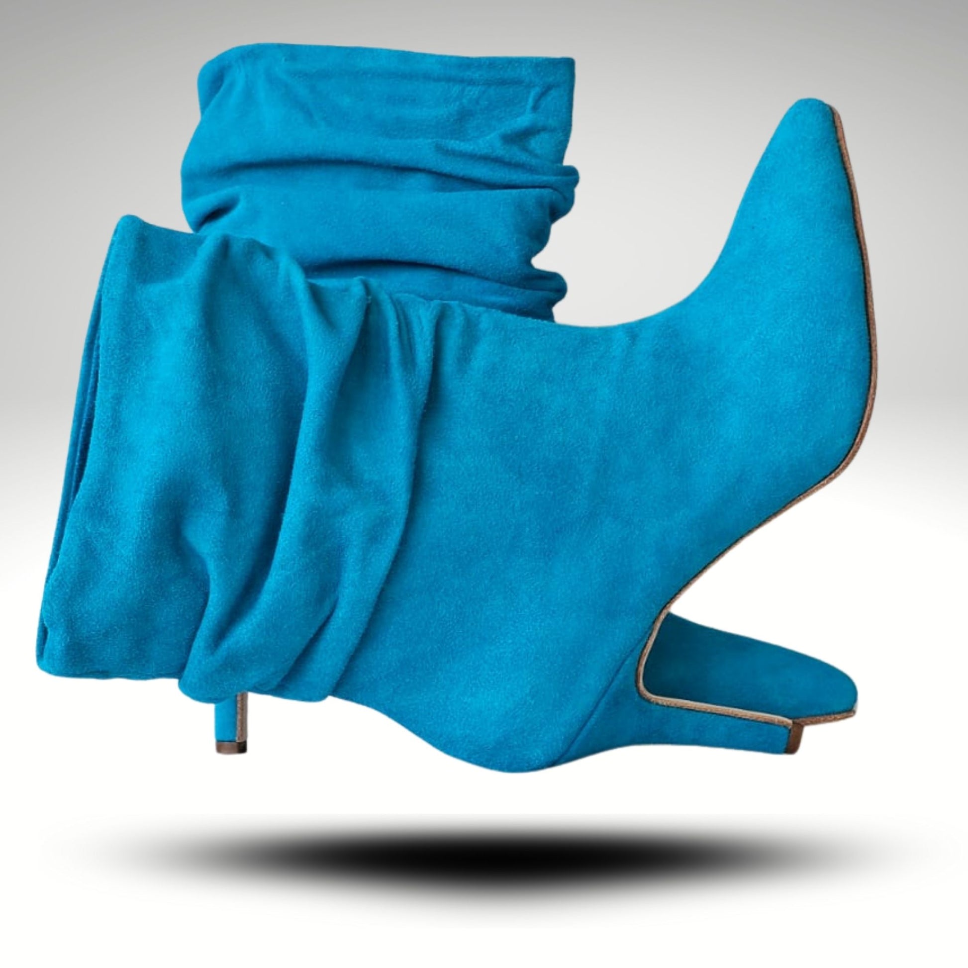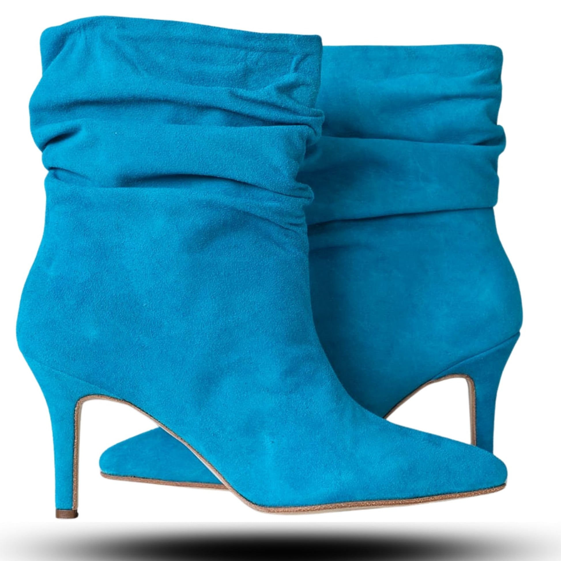 Su color turquesa intenso aporta frescura y personalidad, convirtiéndolo en el punto de luz de cualquier outfit. El taco estiliza sin sacrificar comodidad, mientras que el efecto “slouchy” (caída suave de la caña) le da ese aire moderno y despreocupado.