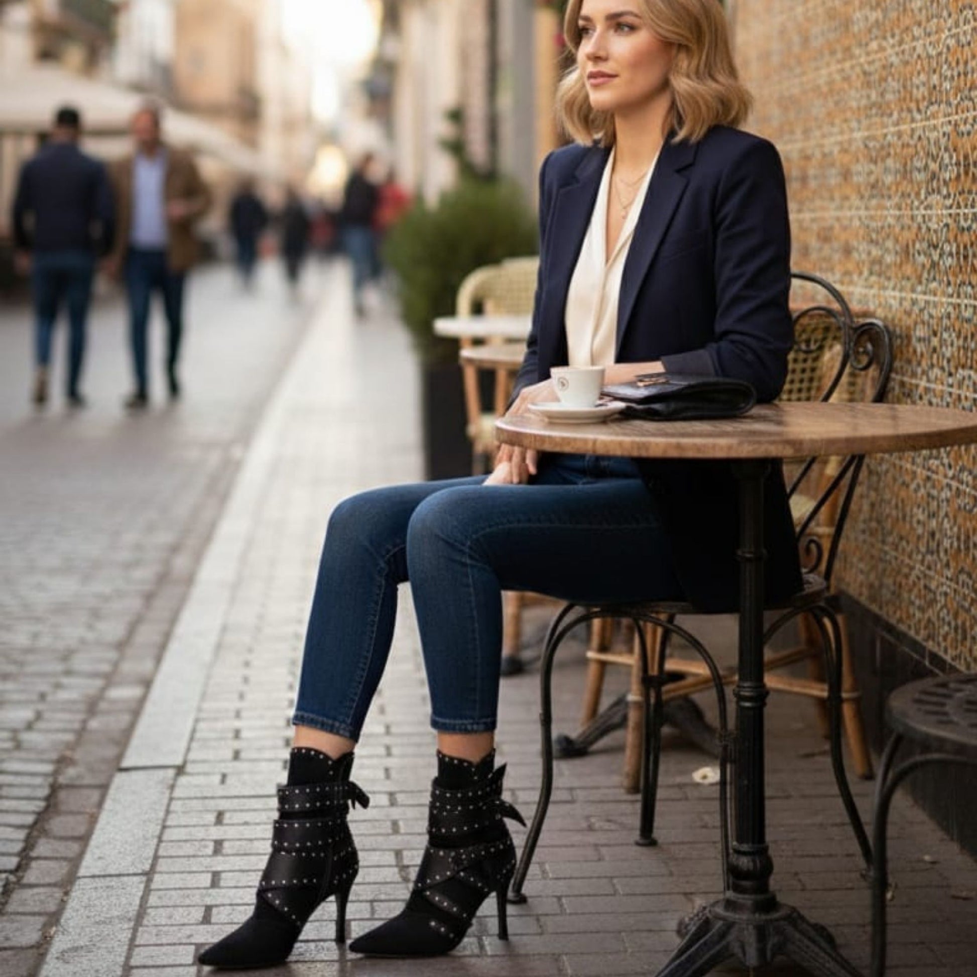 Estos botines negros están hechos completamente de cuero y una convinacion en Gamuza. lo que los hace duraderos y de alta calidad. Su tacón de 7 cm te brindará comodidad y estilo. Además, están decorados con lazos adornados con tachas, permitiendo que les des tu propio estilo único. ¡Con estos botines, tu aspecto será impecable!